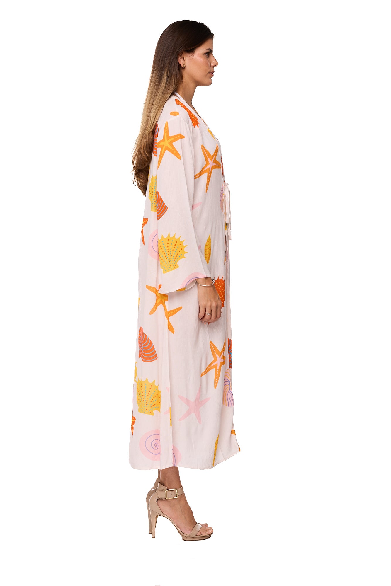 Featuring a soft ivory base adorned with vibrant starfish, seashell, and ocean-inspired prints in coral, orange, and pastel tones, this lightweight beach kimono captures effortless coastal glamour. The wrap-style front with adjustable tie belt creates a flattering silhouette while maintaining relaxed comfort.